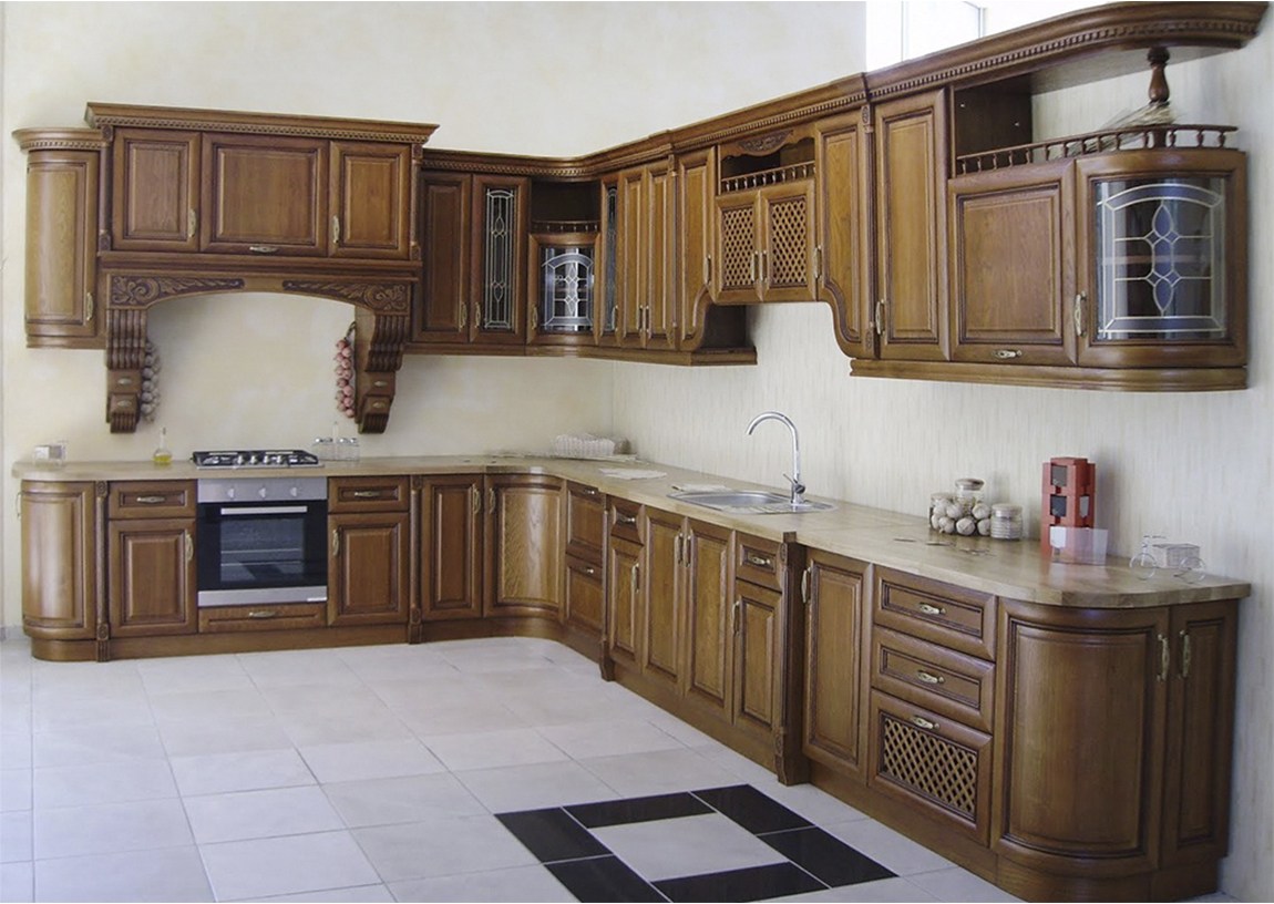 Classic kitchen made of painted wood (ash, oak, maple), decorative wood carvings, ornamental glass facades, countertops made of artificial stone, hardware - Blum...