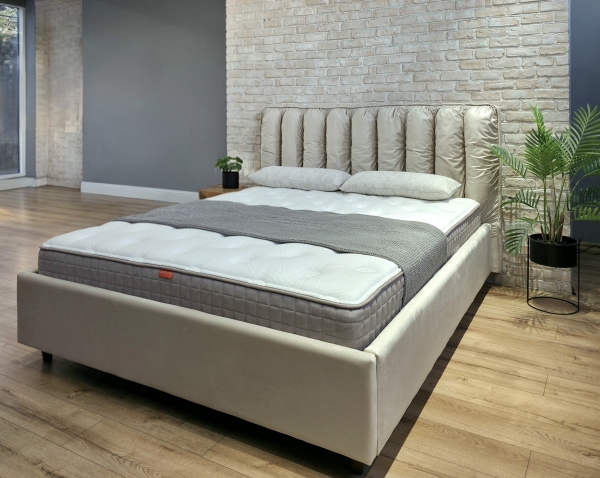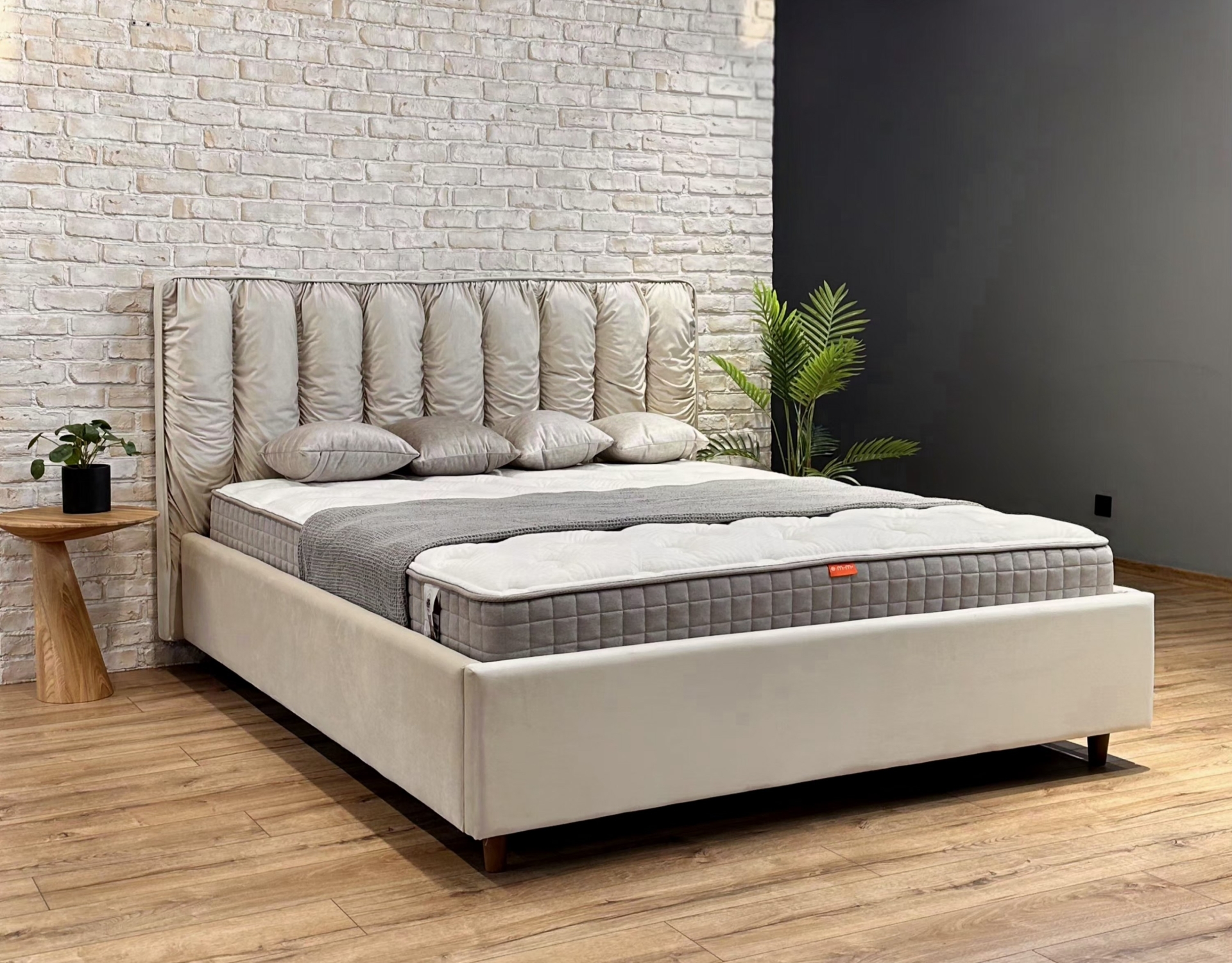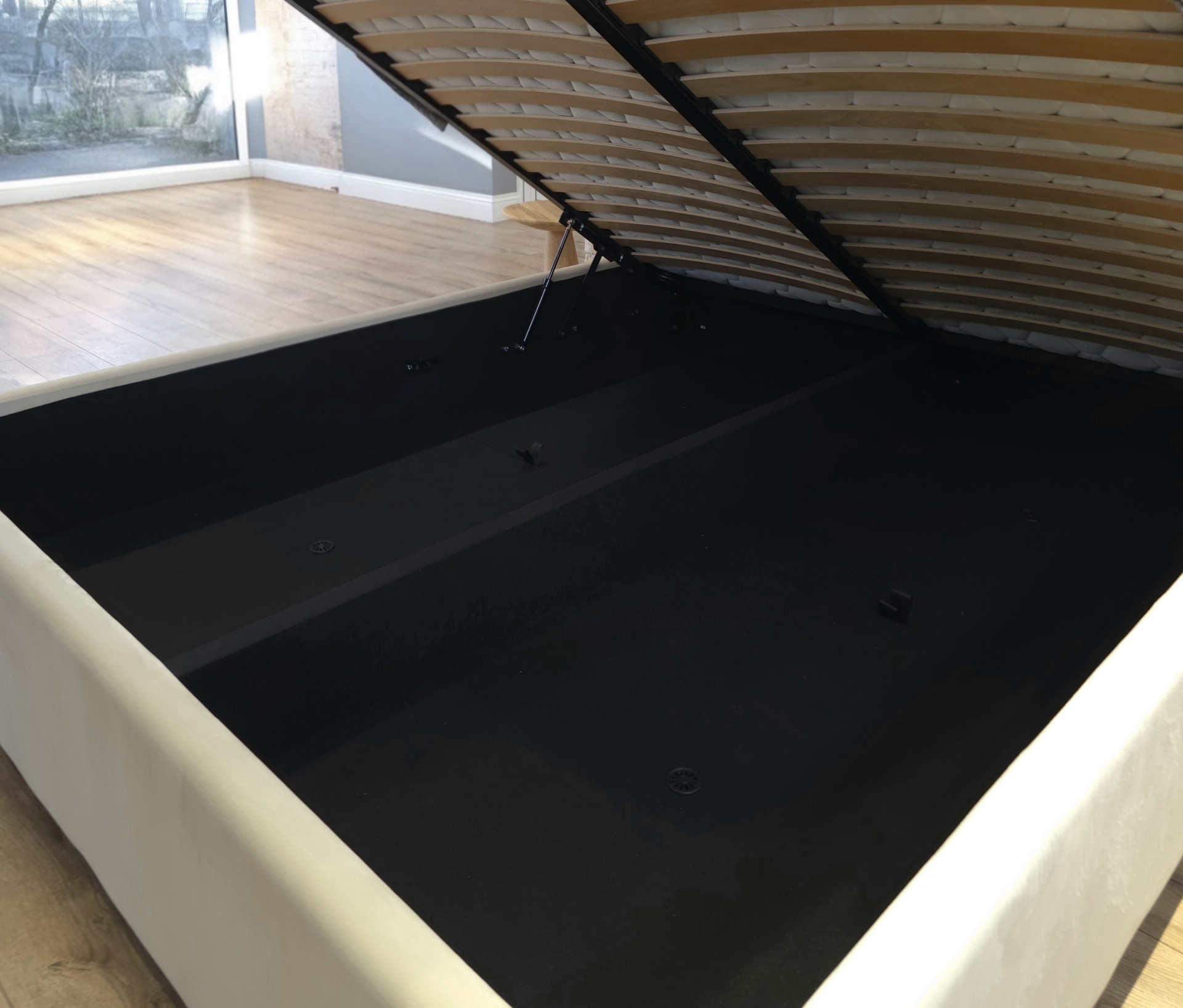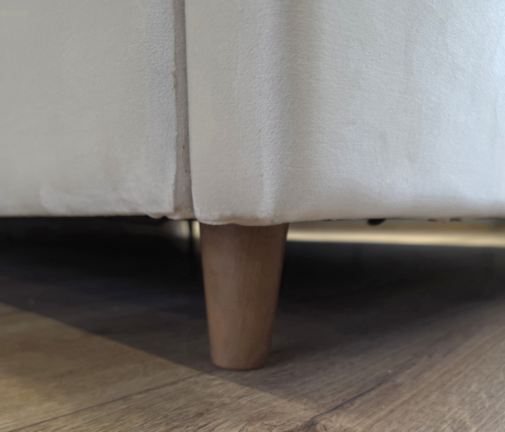 Pat cu mecanism de ridicare, are lada de depozitare din stofa tehnică fibertex, piciorușe din lemn, vopsite în culoarea nucului.