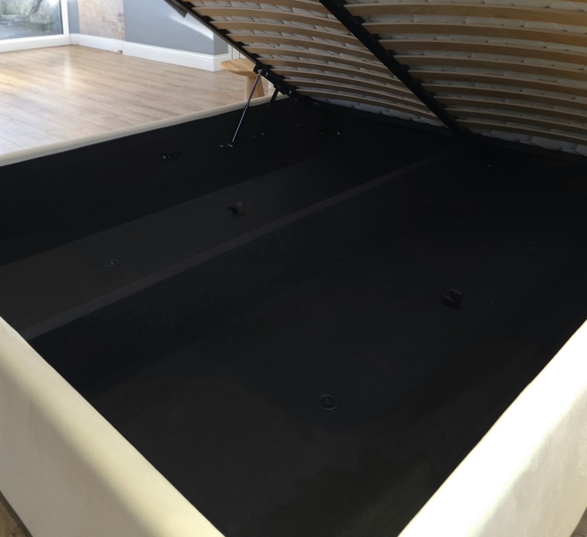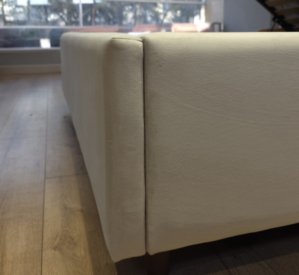 Pat cu mecanism de ridicare, are lada de depozitare din stofa tehnică fibertex, piciorușe din lemn, vopsite în culoarea nucului.