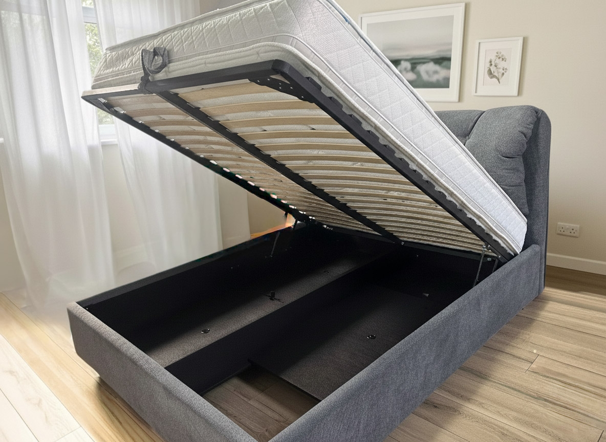 Кровать с подъемным механизмом, разборный ламельный каркас, ящик для хранения белья выполнен полностью из ткани фабертекс, деревянные ножки окрашены в цвет орех. Матрас не входит в стоимость кровати.
