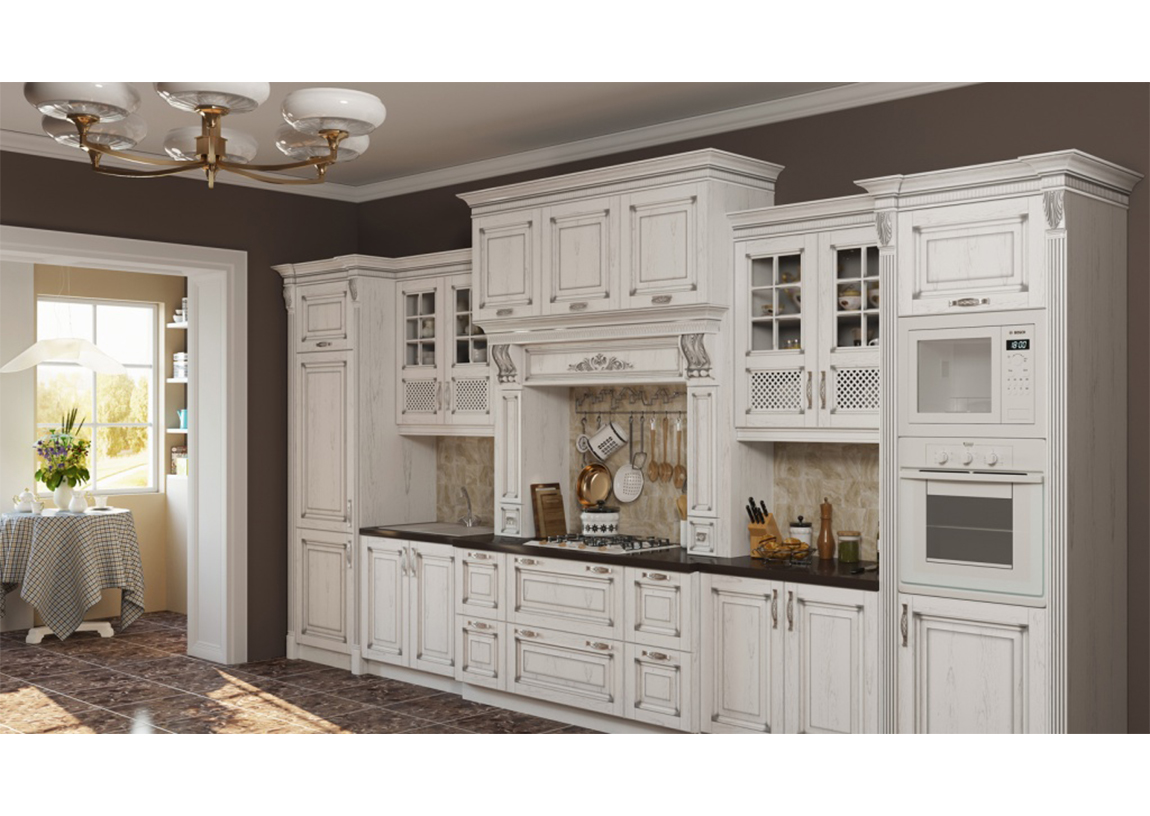 Классическая кухня изготовлена из окрашенного натуральнного дерево ( ясень, дуб, клен ), декоративных деревянных элементов с резьбой, декоративные стеклянные фасады, столешницей из искусственного камня, фурнитурой - Blum, Hettich.