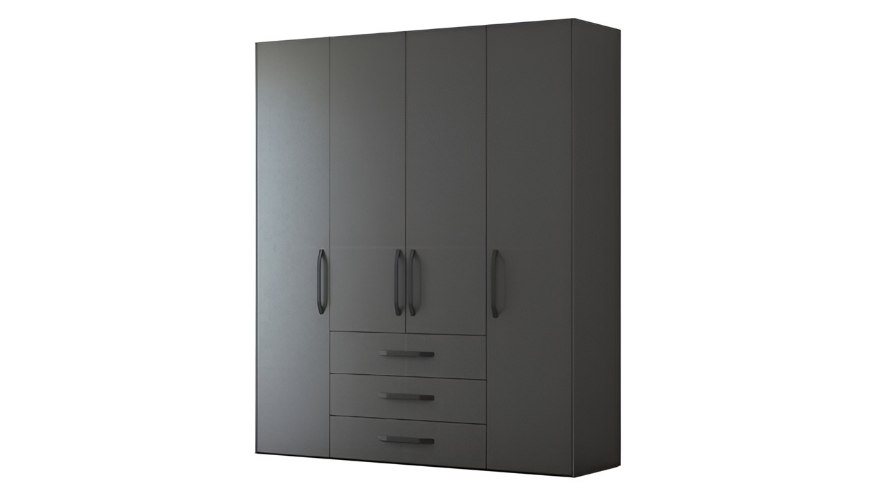 Описание: Вместительный шкаф с четырьмя распашными дверями, ящиками, штангами для одежды и множеством полок.